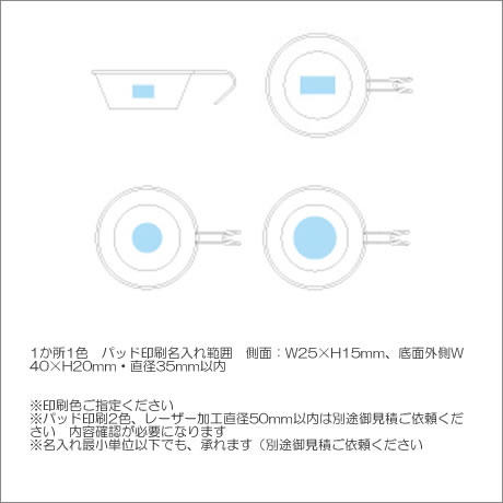 1か所1色 パッド印刷名入れ範囲 側面:W25×H15mm、底面外側W40×H20mm・直径35mm以内