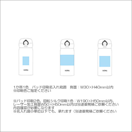 ※印刷色ご指定ください ※パッド印刷2色、回転シルク印刷1色:W190×H50mm以内、レーザー加工側面W50×H50mm以内は別途御見積ご依頼ください 内容確認が必要になります ※名入れ最小単位以下でも、承れます(別途御見積ご依頼ください |