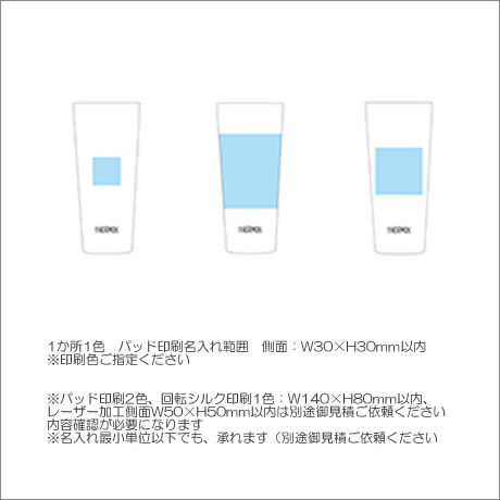 ※印刷色ご指定ください ※パッド印刷2色、回転シルク印刷1色:W140×H80mm以内、レーザー加工側面W50×H50mm以内は別途御見積ご依頼ください 内容確認が必要になります ※名入れ最小単位以下でも、承れます(別途御見積ご依頼ください |