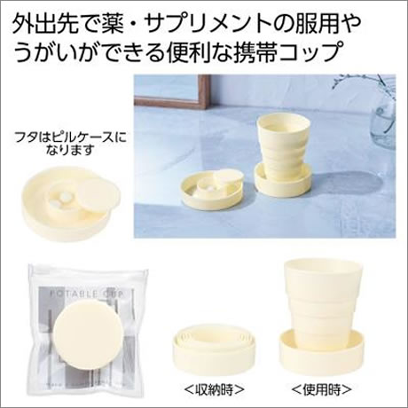 外出先で薬・サプリメントの服用や、うがいをするのに便利な携帯コップです。フタ裏側のピルケースに薬やサプリメントを入れることができます。ボールチェーン付の専用ケース入り。
