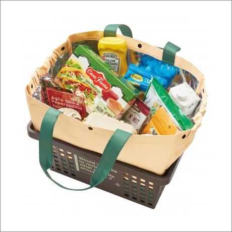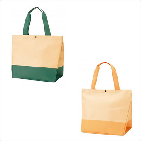 肩掛けできるレジカゴタイプの保冷温バッグ。サイドマチのボタンを外せば容量もたっぷり!間口もボタンで留められます。