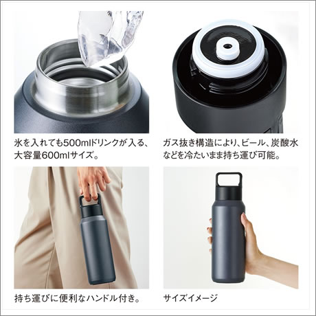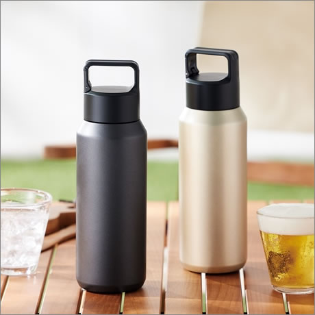 炭酸飲料を冷たいまま持ち運べる、真空2重構造のステンレスボトル。