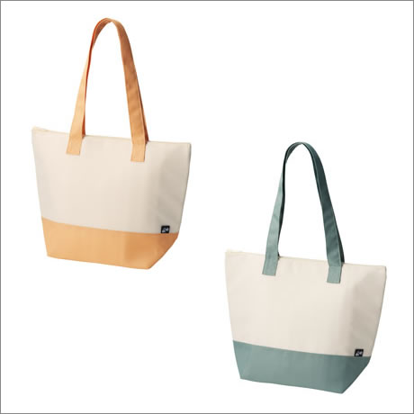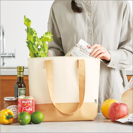 清潔感のある2トーンの肩掛けトートバッグで、気温の高い時期のお買いものも安心。