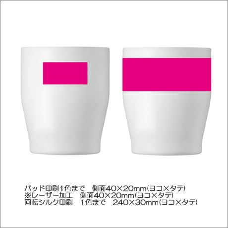 ※レーザー加工 側面40×20mm(ヨコ×タテ)(プリント代 \165/ 版代 \6500) 回転シルク印刷 1色まで 240×30mm(ヨコ×タテ)(プリント代 \180/版代 \20000)は別途御見積御依頼ください |