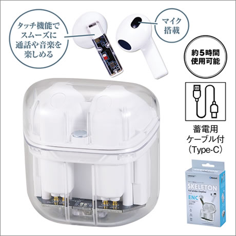 マイク搭載 完全ワイヤレスイヤホン スケルトン