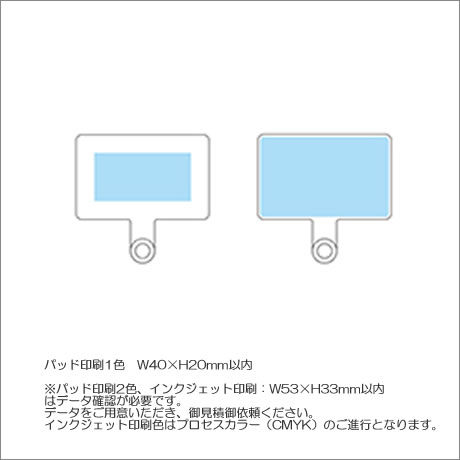 ※パッド印刷2色、インクジェット印刷:W53×H33mm以内はデータ確認が必要です。 データをご用意いただき、御見積御依頼ください。 インクジェット印刷色はプロセスカラー(CMYK)のご進行となります。 |