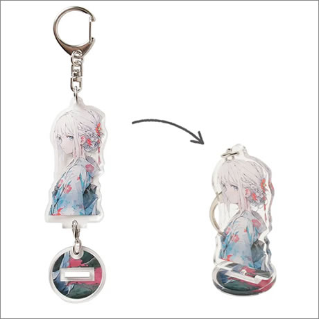 スタンドと台座を連結させて持ち運べるアクリルキーホルダーです。