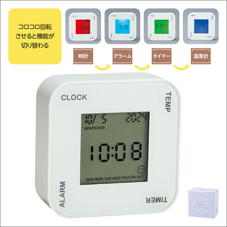 ボタン操作不要!アラーム、タイマーなど向きを変えるだけで機能が切り替わるお手軽コンパクトクロック。