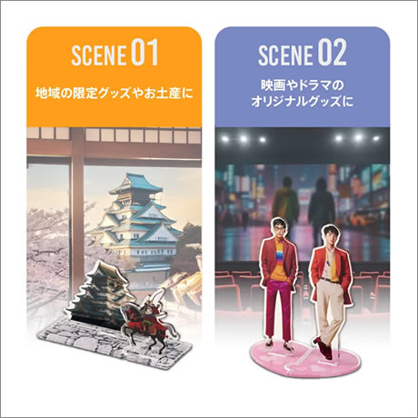 また、地方のお土産等で、ご当地の背景と名物を合体できるようなアクスタや、繋げる事で一つの絵になるようなデザイン等、様々なジャンルで使用可能になっています。