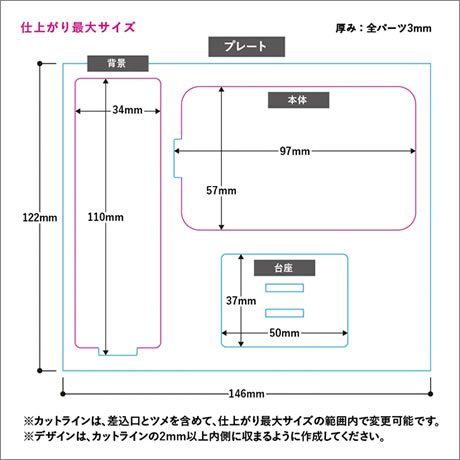 本体サイズ | プレート/146×122×3(mm) 本体/96×57×3mm 背景/34×110×3(mm) 台座/50×37×3(mm) |