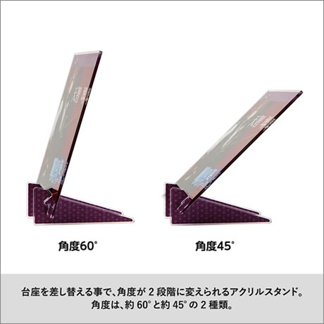 台座部分に溝が2種類あり、それらを差し替える事で、角度が約60° 45°の2種類に変えられます。