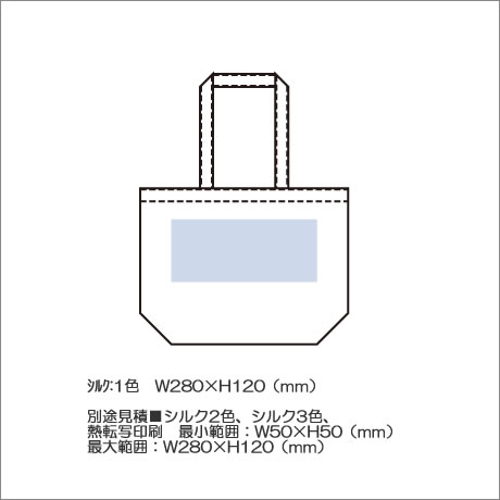 別途見積■シルク2色、シルク3色、熱転写印刷 最小範囲:W50×H50(mm) 最大範囲:W280×H120(mm) |