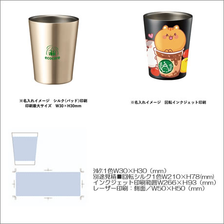 別途見積■回転シルク1色W210×H78(mm)、インクジェット印刷範囲W266(重なり部分含む)×H93(mm)、レーザー印刷:側面/W50×H50(mm)