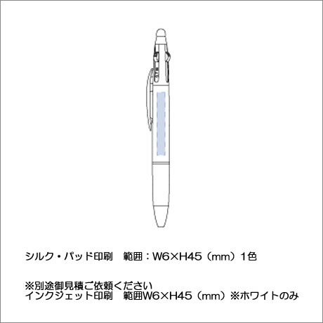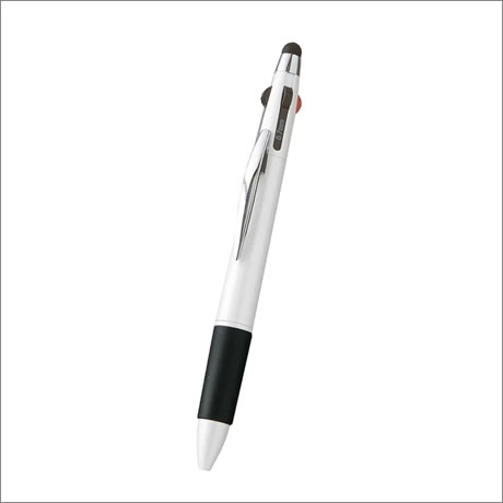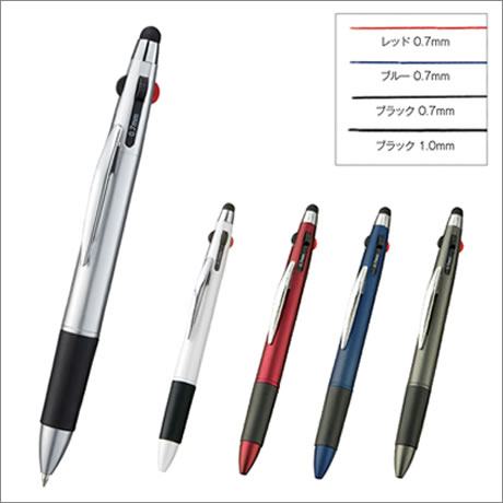にぎりやすいスリムボディの多色ボールペン。タッチペンとしても使える優れものです。使用頻度の高い黒ペンを2本用意しているので、急なインク切れの際にも対応が可能です。名入れは本体側面へのシルク印刷単色加工からインクジェット印刷でのフルカラー印刷まで対応しております。展示会やオープンキャンパスなどの来場記念ノベルティなどにもおススメいたします。(ペン軸:黒1.0mm、0.7mm、赤0.7mm、青0.7mm)
