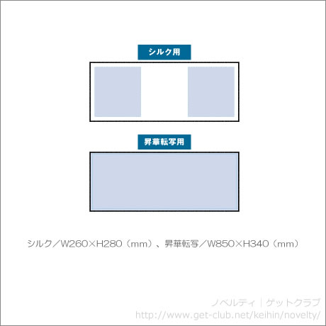 シルク印刷レイアウト可能範囲/シルク/W260×H280(mm)印刷範囲/W70×H70(mm) 別途御見積:昇華転写/W850×H340(mm)