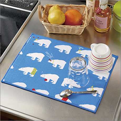 洗い物かごを置くよりも、吸水マットを置いて使ったら仕舞う習慣になると、キッチンがスッキリします。実用性に可愛さも兼ね備えたしろくま柄がかわいい!