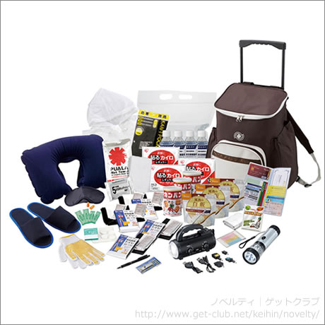 ※ダイナモチャージングラジオライトは一部機種非対応あり" 避難用キャリーバッグ、ダイナモチャージングラジオライト、レインボーランタンライト、首枕、耳栓、アイマスク、スリッパ、非常用持出便利ファイル、緊急用ホイッスル、給水袋(3ℓ)、長期保存米(白米)×3、備蓄用飲料水(500ml)×4、乾パン(100g)×3、軍手、緊急携帯トイレ2P(2回用)×2、緊急携帯トイレ1P(1回用)×2、使い捨てカイロ×3、レスキューシート、キズバン(大×2、小×2)、綿棒10P、ボールペン、ウェットティッシュ(20枚入)、非常用保存ウェットタオル、防寒レインコート、圧縮おしぼり4P