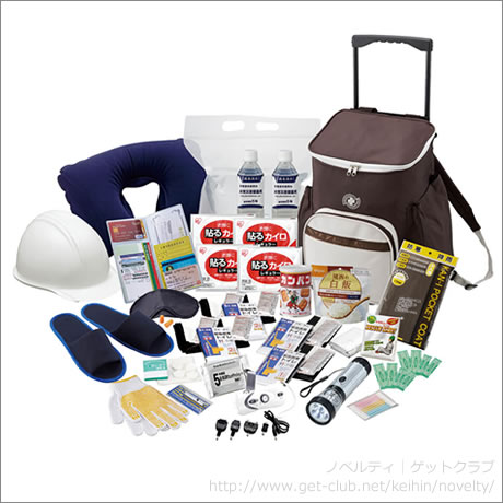 ※ダイナモチャージングラジオライトは一部機種非対応あり" 避難用キャリーバッグ、防災ヘルメット、ダイナモマルチライト、レインボーランタンライト、首枕、耳栓、アイマスク、スリッパ、非常用持出便利ファイル、緊急用ホイッスル、給水袋(3ℓ)、長期保存米(白米)、備蓄用飲料水(500ml)×2、乾パン(100g)、軍手、緊急携帯トイレ2P(2回用)×2、緊急携帯トイレ1P(1回用)×2、使い捨てカイロ×4、レスキューシート、キズバン(大×2、小×2)×2、綿棒10P、ウェットティッシュ(20枚入)、防寒レインコート、圧縮おしぼり4P