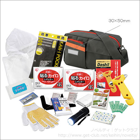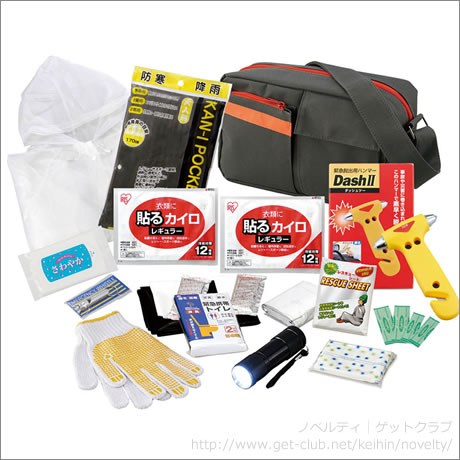 避難用ショルダーバッグ、脱出ハンマー、緊急携帯トイレ2P(2回用)、ポケットティッシュ(10W)、ウェットティッシュ(10枚入)、レスキューシート、使い捨てカイロ×2、強力9光ライト、キズバン(大×2、小×2)、軍手、防寒レインコート、緊急用ホイッスル