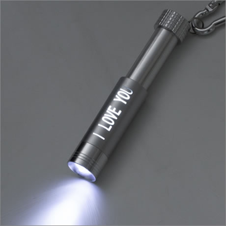 カラビナ付きでバッグなどに取り付け可能。ライトの前面部分をスライドすると照射角度の変更が可能です。レーザー加工をすると、ライトをつけた時に光で文字が浮かび上がります。