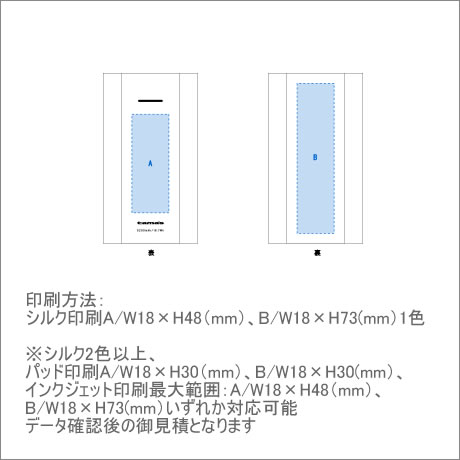 ※シルク2色以上、パッド印刷A/W18×H30(mm)、B/W18×H30(mm)、インクジェット印刷最大範囲:A/W18×H48(mm)、B/W18×H73(mm)いずれか対応可能 データ確認後の御見積となります |