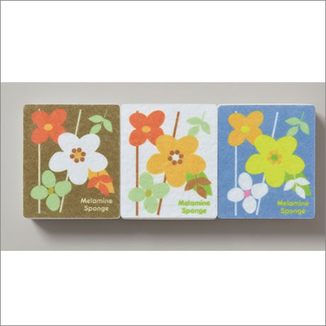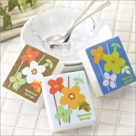 水だけで汚れをキレイに落とす、洗剤いらずのメラミンスポンジは、使いやすいサイズに花の絵柄が3色セット。