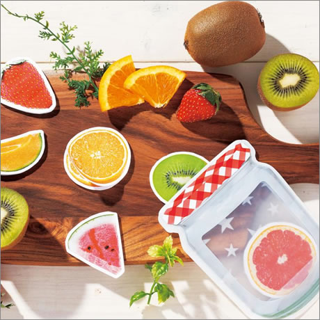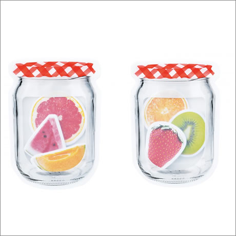 瓶の中にフルーツが!?飾って使って二度おいしい♪ リアルなフルーツプリントのふせんが3種類ずつ入ったジャーパックは、ふせんを使い終わった後も小物入れとして使えます(食品を直接いれないでください)。