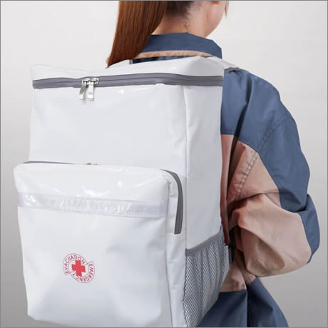 ターポリンリュックバッグ、COB伸縮2WAYライト、非常用ウェットタオル、ウェットティッシュ(20枚)、防寒レインコート、緊急携帯トイレ(大小兼用)2P×2、レスキューシート、軍手、使い捨てカイロ×2、ホイッスル、キズバン(大小×各2)、ポケットティッシュ×2、備蓄用飲料水500㎖、かんぱん100g、首枕、アイマスク、耳栓、ポリラップ、給水袋3L、マスク