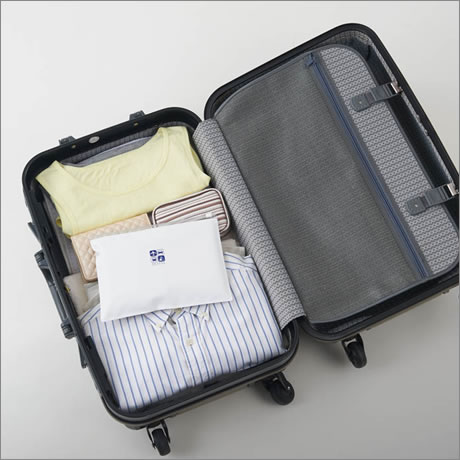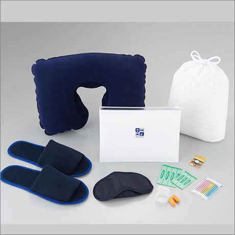飛行機はもちろん、バスや電車での移動に、疲労低減に役立つグッズと、綿棒や衣類収納用の巾着袋、あると助かるソーイングセットにキズバンも入っています。