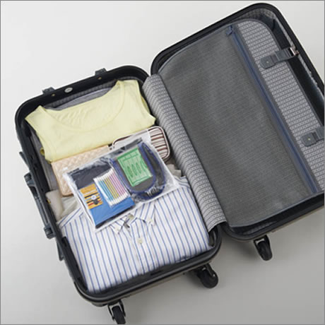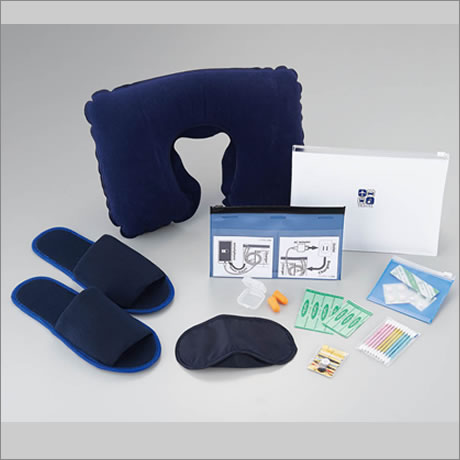 飛行機はもちろん、バスや電車での移動に、疲労低減に役立つグッズと、耳栓やスリッパ、綿棒や衣類収納用の巾着袋、あると助かるソーイングセットにキズバンも入っています。