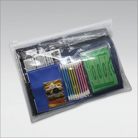 スライダー付き収納ポーチ、首枕、アイマスク、耳栓、スリッパ、携帯お薬・小物袋、キズバン(大小×各2)、綿棒10P、ソーイングセット、モバイルアクセサリーポーチ
