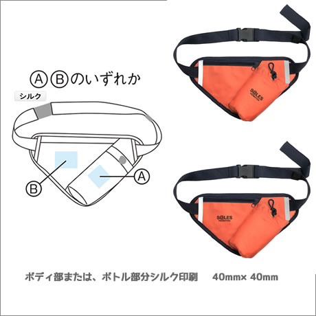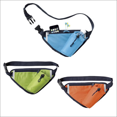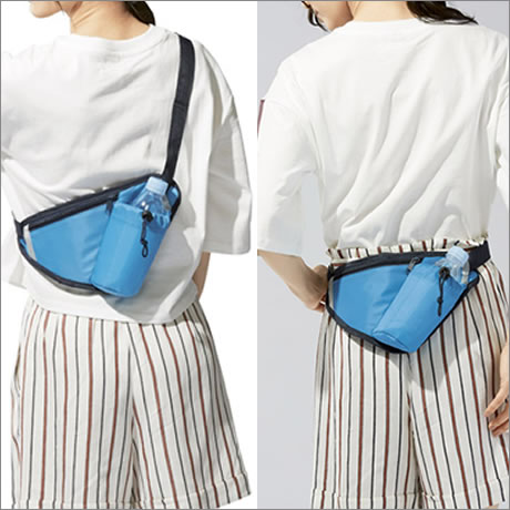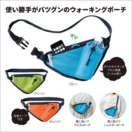 使い勝手のいいウォーキングポーチです。腰に巻いてウエストポーチ、肩にかけてショルダーポーチにもなります。ボトルホルダーはアルミ蒸着フィルム張りの裏地。ヘッドライトの灯りに反射する反射テープ付。