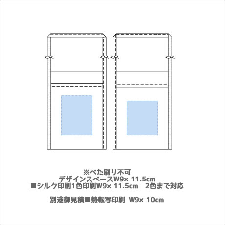 ※別途御見積 2色印刷、熱転写印刷範囲 Sサイズ:W90×H100(mm)※表裏共通、最大サイズ:表/W90×H115(mm)、裏/W90×H100(mm) |