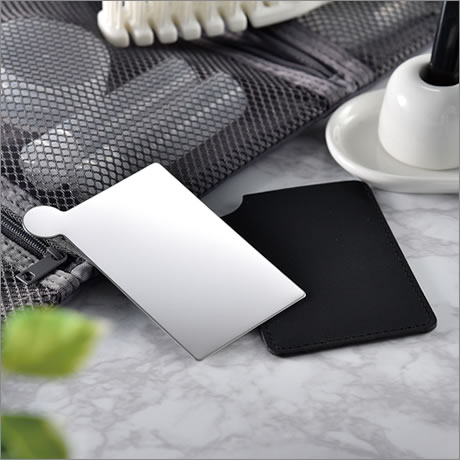 携帯に便利なケース付の薄型カードミラー。ステンレスなので割れる心配ナシ。