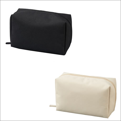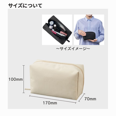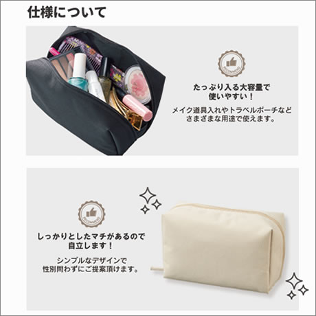 しっかりと自立するポリエステル素材のポーチです。シンプルなデザインなので、性別問わずお使い頂けます。内側にポケットがついており、たっぷり入る大容量なので、コスメポーチからトラベル用の小物入れなど、幅広くお使い頂けます。カラーはミルキーベージュとインクブラックの2色からお選び頂けます。販促品としてはもちろん、キャラクターグッズやスポーツの応援グッズとしてもおすすめの商品です。