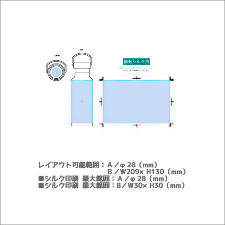 B/W209×H130(mm) ■シルク印刷 最大範囲:A/φ28(mm) ■シルク印刷 最大範囲:B/W30×H30(mm) 2色、3色シルク印刷、回転シルク印刷は別途御見積 ■回転シルク 最大範囲:W209×H130(mm) |