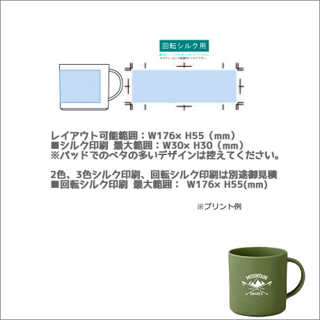 ■シルク印刷 最大範囲:W30×H30(mm) ※パッドでのベタの多いデザインは控えてください。 2色、3色シルク印刷、回転シルク印刷は別途御見積 ■回転シルク印刷 最大範囲: W176×H55(mm) |