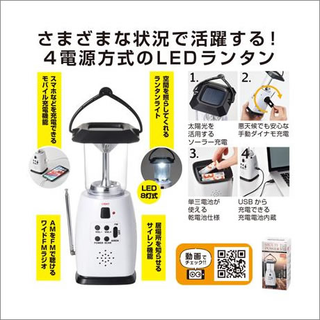 さまざまな状況で活躍する!4電源方式のLEDランタン。空間を照らしてくれるランタンライト・居場所を知らせるサイレン機能・スマホなどを充電できるモバイル充電機能・AMをFMで聴けるワイドFMラジオ。