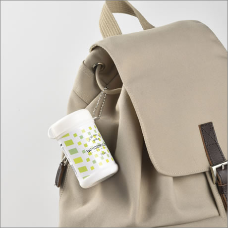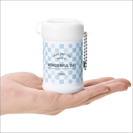 かわいいキーホルダーサイズの携帯型ウェットティッシュ。カバンに付けられるボールチェーン付き。