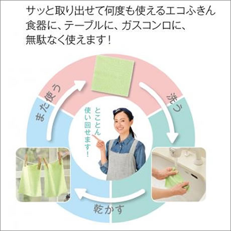 サッと取り出せて何度も使えるエコふきん。食器に、テーブルに、ガスコンロに、無駄なく使えます!