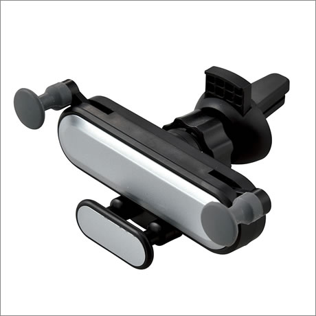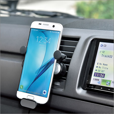 スマホの重みで固定され、取り外しも簡単。カーエアコンの吹き出しにセットしてスマホスタンドに。