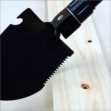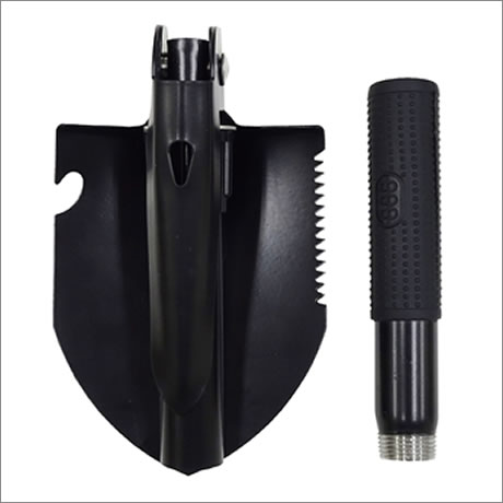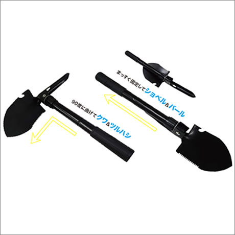 クワ、ノコギリ、栓抜き、ツルハシ、バールなど、多用途に使え、コンパクトに折りたためるショベルです。