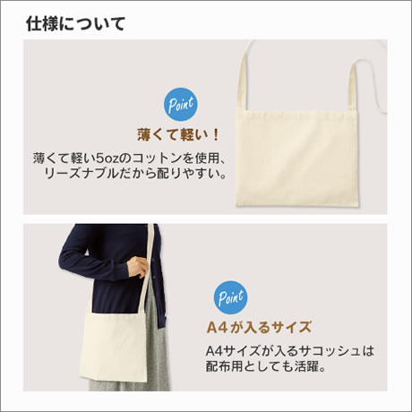 また、薄くて軽い5オンスの生地を使用しており、リーズナブルにオリジナルのサコッシュの制作ができます。