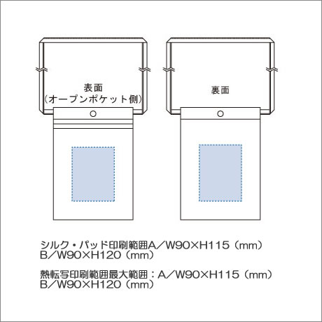 シルク印刷2色、3色、フルカラー熱転写印刷(W9×10cm)は別途御見積ご依頼ください ※熱転写印刷範囲 最大範囲:A/W90×H115(mm) B/W90×H120(mm) |