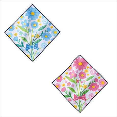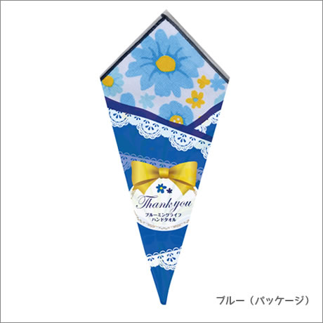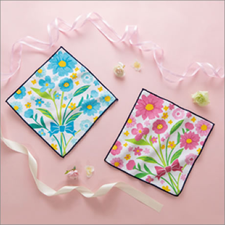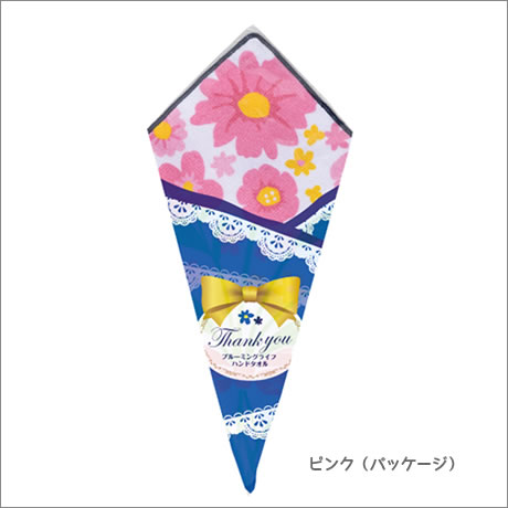 あざやかな花柄のハンドタオルを、ブーケのようなパッケージで包みました。