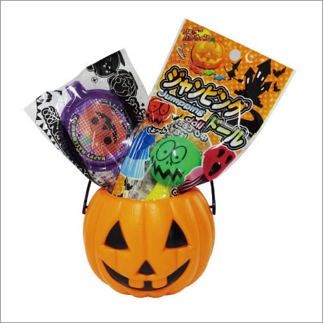 ハロウィンおもちゃが、まんまるかぼちゃバケツに入ったおもちゃのセット