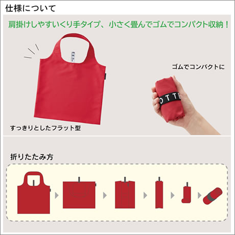 肩掛けしやすい「くり手タイプ」の持ち手、クルリトシリーズの特徴であるゴムが付で折りたたんでコンパクトに持ち運ぶことが出来ます。