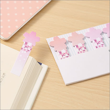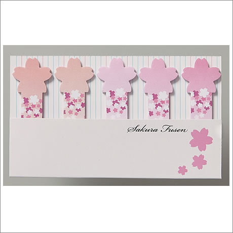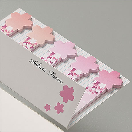 ポケットサイズのカバーに、桜の花の形で型抜きをしたふせんが5色×各20まいセットされています。