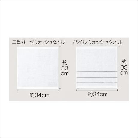 | 本体サイズ | 二重ガーゼウォッシュタオル/約34×33cm パイルウォッシュタオル/約34×33cm |