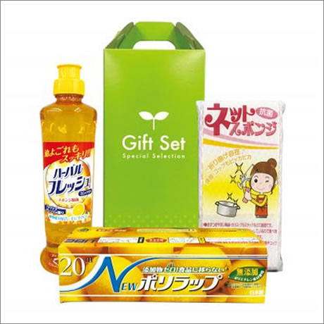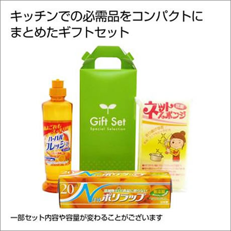 コンパクトな取っ手付きの化粧箱に食器洗剤・ラップ・ネットスポンジのキッチン用品3点が入ったセットです。